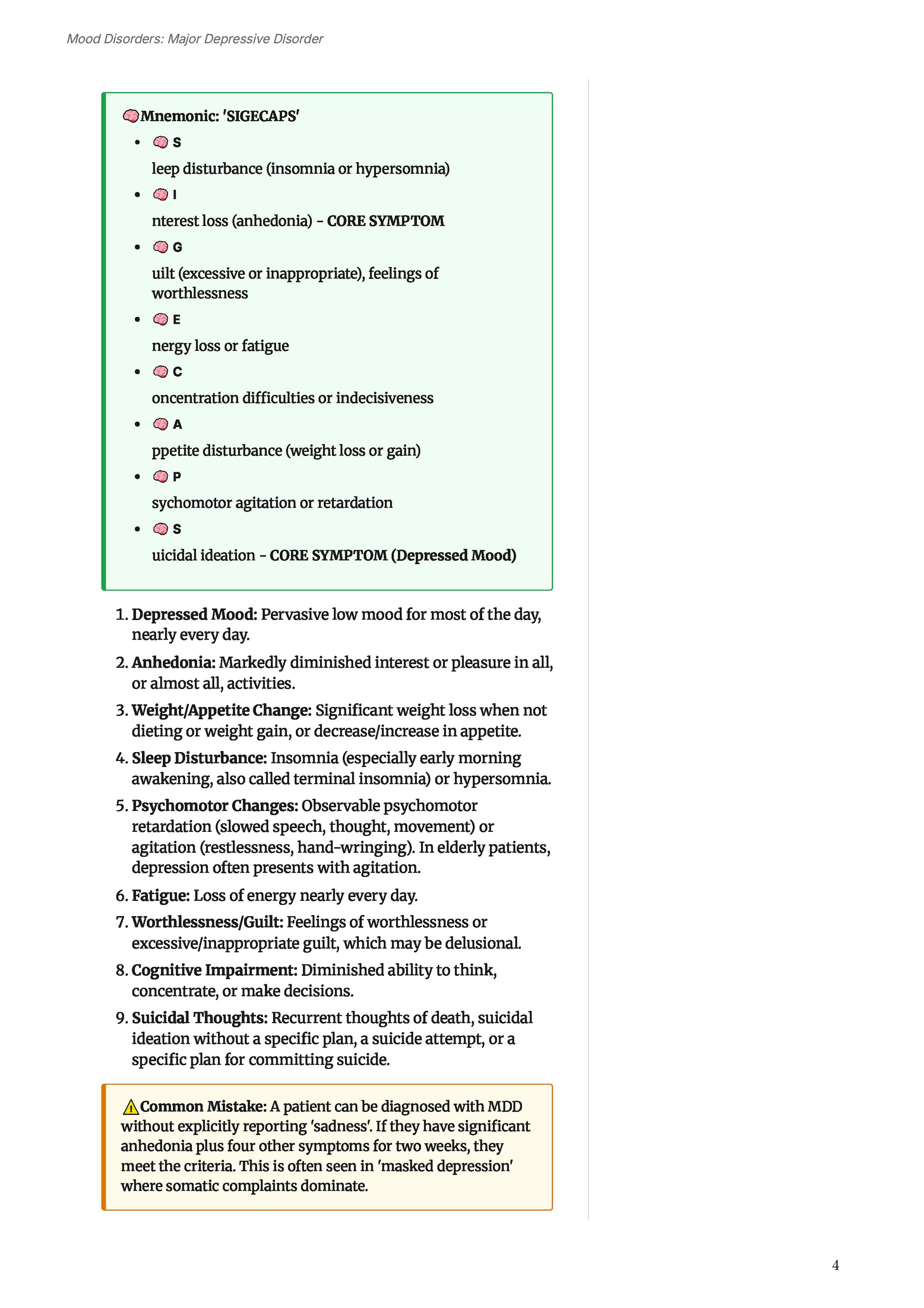 | Mood Disorders | - Major Depressive Disorder - Bipolar Disorder - Dysthymia - Cyclothymia |